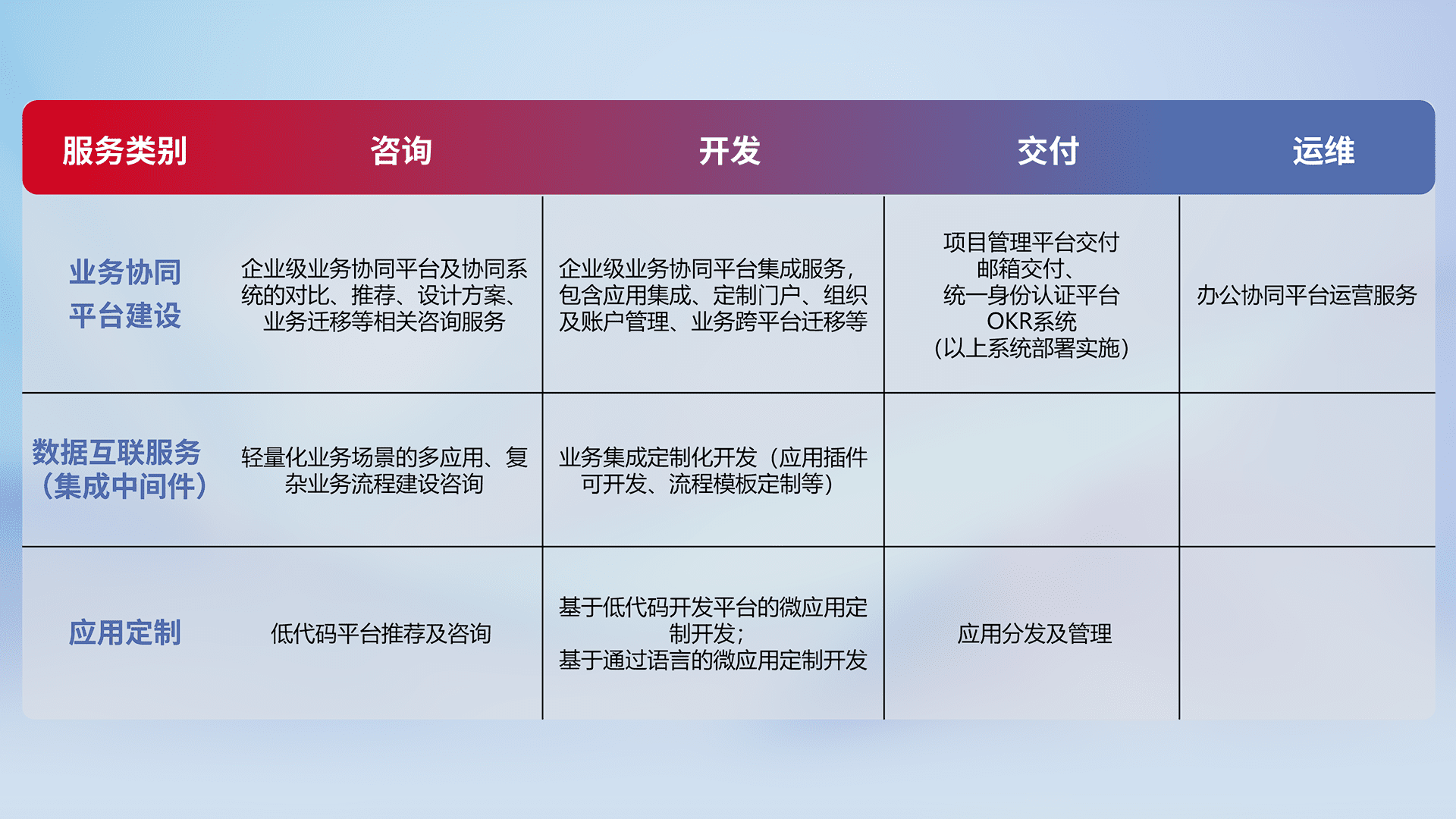 针对钉钉、、、企微、、、IDaas等平台级产品提供产品的规划、、、方案、、、、交付、、定制化开发等服务,,实现如统一协同办公、、智能客户服务、、、混合会议管理、、、、智能数据查询、、、、等业务场景,,实现数字化转型。。